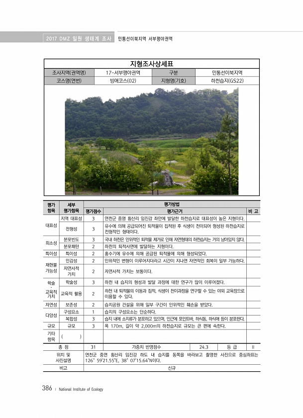 2017 DMZ 일원 생태계 조사 민통선이북지역 서부평야권역 386 ? National Institute of Ecology 지형조사상세표 조사지역 권역명 17-서부평야권역 구분 민통선이북지역 코스명 연번 빙애코스 02 지형명 기호 하천습지 GS22 평가 항목 세부 평가항목 평가방법 평가점수 평가근거 비 고 대표성 지역 대표성 3 연천군 중명 횡산리 임진강 좌안에 발달한 하천습지로 대표성이 높은 지형이다. 전형성 3 유수에 의해 공급되어진 퇴적물이 집적된 후 식생이 천이되어 형성된 하천습지로 전형적인 형태이다. 희소성 분포빈도 3 국내 하천은 인위적인 퇴적물 제거로 인해 자연형태의 하천습지는 거의 남아있지 않다. 분포패턴 2 하천의 퇴적사면에 발달하는 지형이다. 특이성 특이성 2 홍수기에 유수에 의해 공급된...