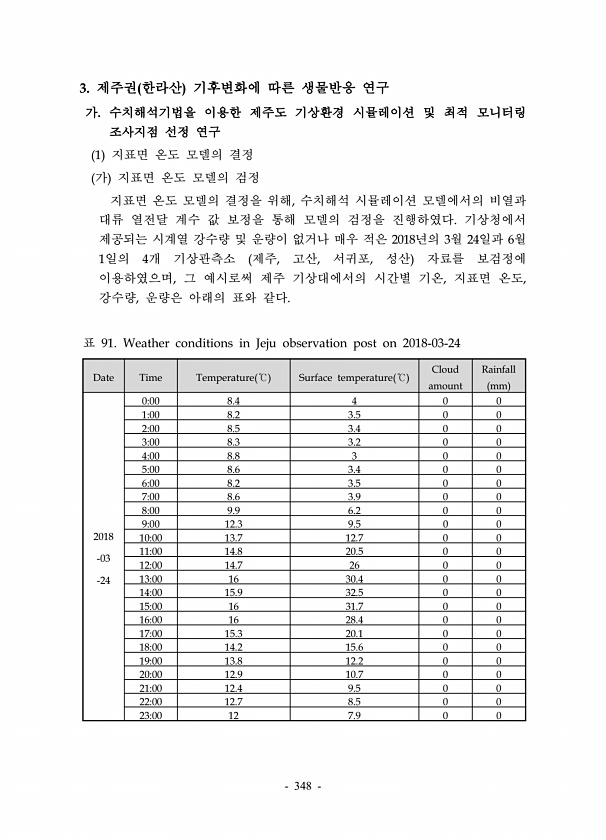 348 3. 제주권 한라산 기후변화에 따른 생물반응 연구 가. 수치해석기법을 이용한 제주도 기상환경 시뮬레이션 및 최적 모니터링 조사지점 선정 연구 1 지표면 온도 모델의 결정 가 지표면 온도 모델의 검정 지표면 온도 모델의 결정을 위해, 수치해석 시뮬레이션 모델에서의 비열과 대류 열전달 계수 값 보정을 통해 모델의 검정을 진행하였다. 기상청에서 제공되는 시계열 강수량 및 운량이 없거나 매우 적은 2018년의 3월 24일과 6월 1일의 4개 기상관측소 제주, 고산, 서귀포, 성산 자료를 보검정에 이용하였으며, 그 예시로써 제주 기상대에서의 시간별 기온, 지표면 온도, 강수량, 운량은 아래의 표와 같다. Date Time Temperature ℃ Surface temperature ℃ Cloud amount ...
