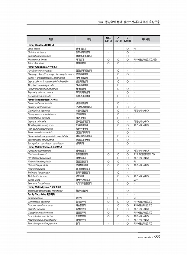 viii. 동강유역 생태·경관보전지역의 주간 육상곤충 www.nie.re.kr ?383 학명 국명 최&강 2018 A 2013 B 2011 특이사항 Family Cleridae 개미붙이과 Opilo mollis 긴개미붙이 ○ 국 Orthrius striatulus 줄무늬개미붙이 ○ Stigmatium pilosellum 털점박이개미붙이 ○ Thanasimus lewisi 개미붙이 ○ ○ ○ 국,적 관심대상 LC ,해충 Trichodes sinae 불개미붙이 ○ ○ Family Attelabidae 거위벌레과 Apoderus erythrogaster 검정날개거위벌레 ○ Compsapoderus Compsapoderus erythropterus 북방거위벌레 ○ ...