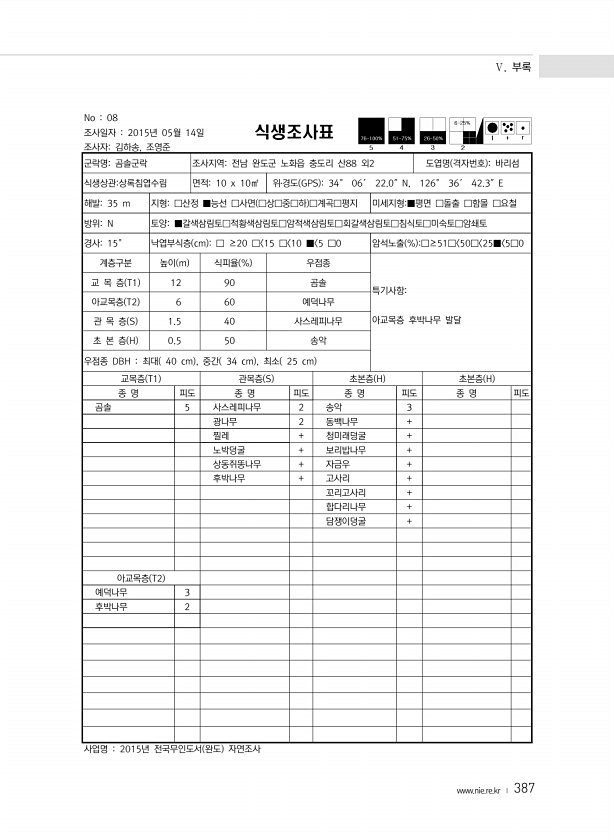 Ⅴ. 부록 www.nie.re.kr ? 387 No 08 조사일자 2015년 05월 14일 조사자김하송, 조영준 식생조사표 군락명곰솔군락 조사지역전남 완도군 노화읍 충도리 산88 외2 도엽명 격자번호 바리섬 식생상관상록침엽수림 면적10 x 10㎡ 위?경도 GPS 34° 06′ 22.0″N, 126° 36′ 42.3″E 해발35 m 지형□산정 ■능선 □사면 □상□중□하 □계곡□평지 미세지형■평면 □돌출 □함몰 □요철 방위N 토양■갈색삼림토□적황색삼림토□암적색삼림토□회갈색삼림토□침식토□미숙토□암쇄토 경사15° 낙엽부식층 cm □ ≥20 □ 15 □ 10 ■ 5 □0 암석노출 % □≥51□ 50□ 25■ 5□0 계층구분 높이 m 식피율 % 우점종 특기사항아교목층 후박나무 발달 교 목 층 T1 12 90 곰솔 아교...