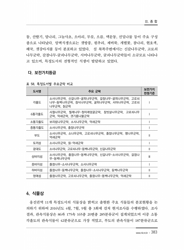 Ⅲ. 종 합 www.nie.re.kr ? 383 동, 산딸기, 말나리, 그늘사초, 으아리, 무릇, 으름, 맥문동, 선밀나물 등이 주요 구성 종으로 나타났다. 암벽식생으로는 갯방풍, 원추리, 제비쑥, 개별꽃, 참나리, 현호색, 해국, 갯강아지풀 등이 분포하고 있었다. 섬 북쪽주변에서는 신갈나무군락, 고로쇠 나무군락, 갈참나무-굴피나무군락, 서어나무군락, 굴피나무군락들이 소규모로 나타나 고 있으며, 특정도서의 전형적인 식생이 발달하고 있었다. 다. 보전가치등급 표 58. 특정도서별 주요군락 비교 도서명 주요 군락 보전가치 판정기준 각흘도 소사나무군락, 신갈나무-굴피나무군락, 갈참나무-굴피나무군락, 고로쇠 나무-동백나무군락, 참식나무군락, 굴피나무군락, 서어나무군락, 고로쇠 나무군락, 칡군락 Ⅰ 6통각흘도 사철나...