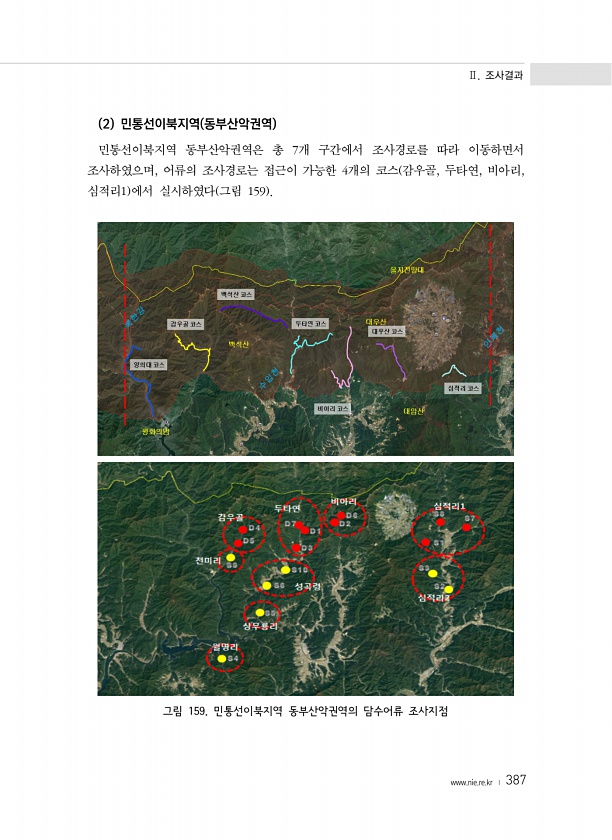 Ⅱ. 조사결과 www.nie.re.kr ? 387 2 민통선이북지역 동부산악권역 민통선이북지역 동부산악권역은 총 7개 구간에서 조사경로를 따라 이동하면서 조사하였으며, 어류의 조사경로는 접근이 가능한 4개의 코스 감우골, 두타연, 비아리, 심적리1 에서 실시하였다 그림 159 그림 159. 민통선이북지역 동부산악권역의 담수어류조사지점