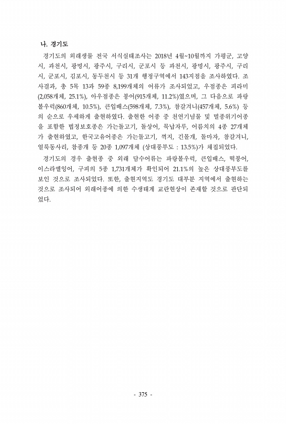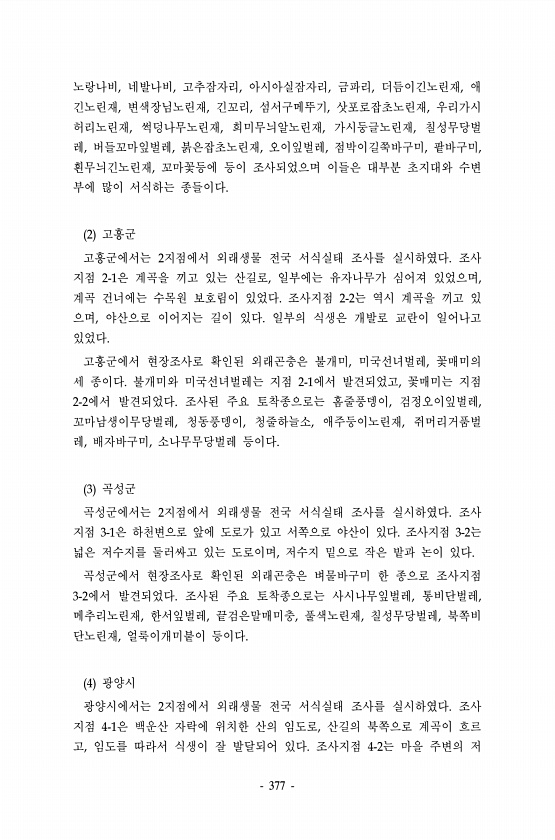 377 노랑나비, 네발나비, 고추잠자리, 아시아실잠자리, 금파리, 더듬이긴노린재, 애 긴노린재, 변색장님노린재, 긴꼬리, 섬서구메뚜기, 삿포로잡초노린재, 우리가시 허리노린재, 썩덩나무노린재, 희미무늬알노린재, 가시둥글노린재, 칠성무당벌 레, 버들꼬마잎벌레, 붉은잡초노린재, 오이잎벌레, 점박이길쭉바구미, 팥바구미, 흰무늬긴노린재, 꼬마꽃등에 등이 조사되었으며 이들은 대부분 초지대와 수변 부에 많이 서식하는 종들이다. 2 고흥군 고흥군에서는 2지점에서 외래생물 전국 서식실태 조사를 실시하였다. 조사 지점 2-1은 계곡을 끼고 있는 산길로, 일부에는 유자나무가 심어져 있었으며, 계곡 건너에는 수목원 보호림이 있었다. 조사지점 2-2는 역시 계곡을 끼고 있 으며, 야산으로 이어지는 길이 있다. 일부의 식생은 개발로...