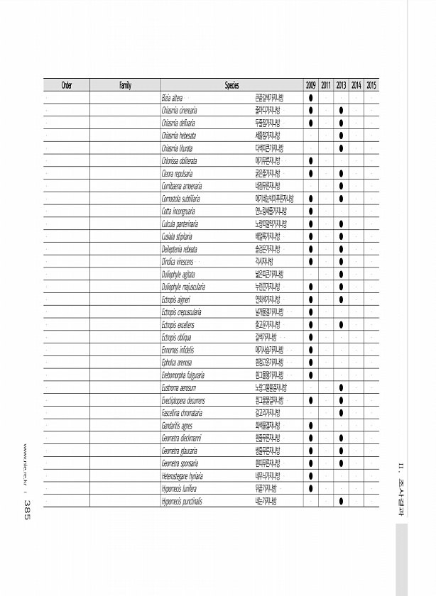 385 Order Family Species 2009 2011 2013 2014 2015 Bizia altera 큰끝갈색가지나방 ● Chiasmia cinerearia 줄마디가지나방 ● ● Chiasmia defixaria 두줄점가지나방 ● ● Chiasmia hebesata 세줄점가지나방 ● Chiasmia liturata 다색띠큰가지나방 ● Chlorissa obliterata 애기푸른자나방 ● Cleora repulsaria 굵은줄가지나방 ● ● Comibaena amoenaria 네점푸른자나방 ● Comostola subtiliaria 애기네눈박이푸른자나방 ● ● Cot...