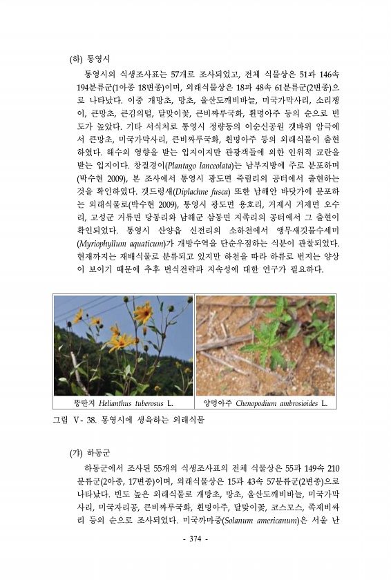하 통영시 통영시의 식생조사표는 57개로 조사되었고, 전체 식물상은 51과 146속 194분류군 1아종 18변종 이며, 외래식물상은 18과 48속 61분류군 2변종 으 로 나타났다. 이중 개망초, 망초, 울산도깨비바늘, 미국가막사리, 소리쟁 이, 큰망초, 큰김의털, 달맞이꽃, 큰비짜루국화, 흰명아주 등의 순으로 빈 도가 높았다. 기타 서식처로 통영시 정량동의 이순신공원 갯바위 암극에 서 큰망초, 미국가막사리, 큰비짜루국화, 흰명아주 등의 외래식물이 출현 하였다. 해수의 영향을 받는 입지이지만 관광객들에 의한 인위적 교란을 받는 입지이다. 창질경이 Plantago lanceolata 는 남부지방에 주로 분포하며 박수현 2009 , 본 조사에서 통영시 광도면 죽림리의 공터에서 출현하는 것을 확인하였다. 갯드렁새...