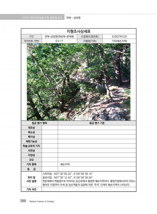 2018 백두대간보호지역 생태계 조사 댓재 삽당령 388 ? National Institute of Ecology 지형조사상세표 구간 댓재삽당령 원방재생계령 도엽명 도엽번호 도전 378122 격자번호-연번 E3-17 지형명 기호 기타 훼손지역 등급 평가 항목 등급 평가 기준 대표성 희소성 특이성 재현가능성 학술?교육적 가치 자연성 다양성 규모 기타 항목 훼손지역 등 급 위치 및 사진 설명 시작지점 N37°30′05.32″, E128°58′26.15″ 종료지점 N37°30′12.42″, E128°58′30.34″ 원방재에서 백봉령으로 이어지는 등산로에서 촬영한 훼손지역이다. 촬영지점에서부터 250m 떨어진 지점까지 우세 및 등산객들의 답압에 의한 ‘주의’ 단계의 훼손지역이 나타난다. 기타의견