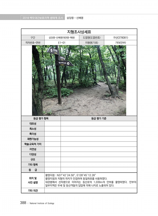 2018 백두대간보호지역 생태계 조사 삽당령 신배령 388 ? National Institute of Ecology 지형조사상세표 구간 삽당령신배령 대관령매봉 도엽명 도엽번호 구산 378081 격자번호-연번 E1-01 지형명 기호 기타 안부 등급 평가 항목 등급 평가 기준 대표성 희소성 특이성 재현가능성 학술?교육적 가치 자연성 다양성 규모 기타 항목 등 급 위치 및 사진 설명 촬영지점 N37°42′24.50″, E128°45′12.28″ 촬영지점과 지형의 위치가 인접하여 동일좌표를 사용하였다. 대관령에서 선자령으로 이어지는 등산로의 1,039m의 안부를 촬영하였다. 안부의 일부지역은 우세 및 등산객들의 답압에 의해 나지로 노출되어 있다. 기타의견