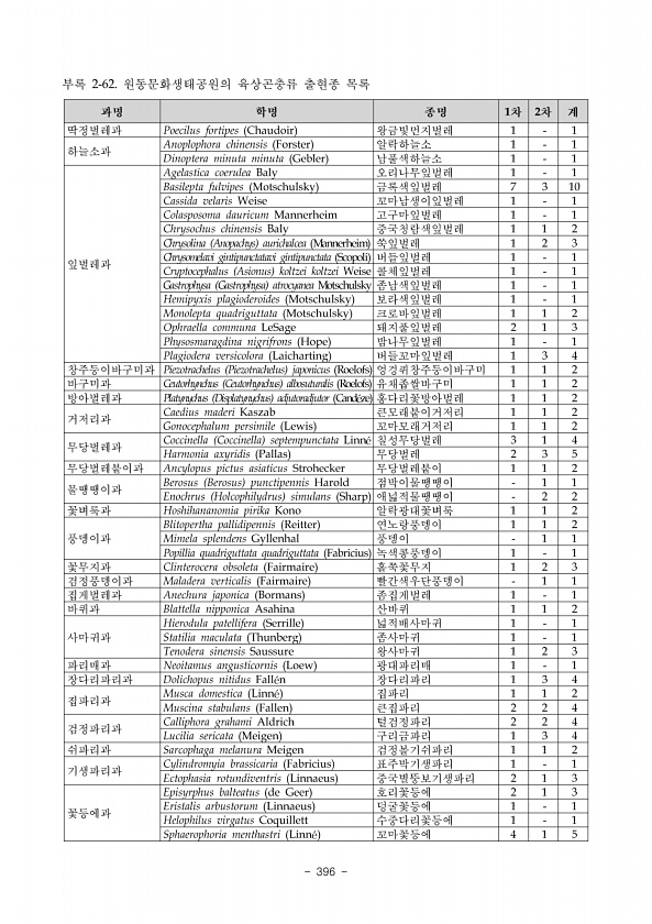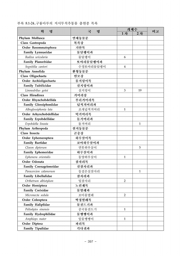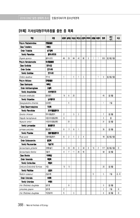 2018 DMZ 일원 생태계 조사 민통선이북지역 중부산악권역 388 ? National Institute of Ecology 학명 국명 도창리 성재산 대성산 적근산 산양리 주파리 고둔골 비운이 합계 조사 시기 비고 Phylum Platyhelminthes 편형동물문 Class Turbellaria 와충강 Order Tricladida 삼기장목 Family Planariidae 플라나리아과 Dugesia japonica 플라나리아 49 39 84 40 80 9 1 1 303 봄,여름,가을 Phylum Nematomorpha 유선형동물문 Class Gordioida 연가시강 Order Gordea 연가시목 Family Gordiidae 연가시과 Gordius aquaticus 연가시 1 1 1 5 1 9 봄,여...