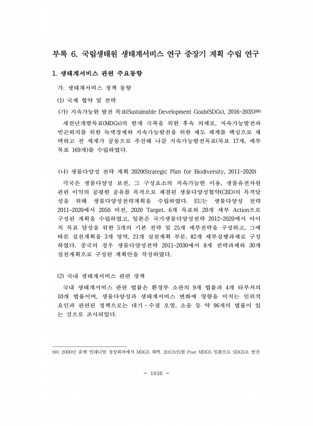 1036 부록 6. 국립생태원 생태계서비스 연구 중장기 계획 수립 연구 1. 생태계서비스 관련 주요동향 가. 생태계서비스 정책 동향 1 국제 협약 및 전략 가 지속가능한 발전 목표 Sustainable Development Goals SDGs , 20162035 98 새천년개발목표 MDGs 의 한계 극복을 위한 후속 의제로, 지속가능발전과 빈곤퇴치를 위한 녹색경제와 지속가능발전을 위한 제도 체계를 핵심으로 채 택하고 전 세계가 공동으로 추진해 나갈 지속가능발전목표 목표 17개, 세부 목표 169개 를 수립하였다. 나 생물다양성 전략 계획 2020 Strategic Plan for Biodiversity, 20112020 각국은 생물다양성 보전, 그 구성요소의 지속가능한 이용, 생물유전자원 관련 이익의 공평한...