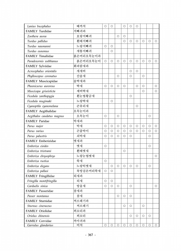 367 Lanius bucephalus 때까치 ○ ○ ○ ○ ○ FAMILY Turdidae 지빠귀과 Zoothera aurea 호랑지빠귀 ○ ○ Turdus pallidus 흰배지빠귀 ○ ○ ○ ○ ○ ○ Turdus naumanni 노랑지빠귀 ○ ○ Turdus eunomus 개똥지빠귀 ○ FAMILY Timaliidae 붉은머리오목눈이과 Paradoxornis webbianus 붉은머리오목눈이 ○ ○ ○ ○ ○ ○ ○ ○ ○ FAMILY Sylviidae 휘파람새과 Acrocephalus orientalis 개개비 ○ ○ Phylloscopus coronatus 산솔새 ○ ○ ○ FAMILY Muscicapidae 솔딱새과 Phoenicurus auroreus 딱새 ○ ○ ○ ○ ○ ○ ○ Muscic...