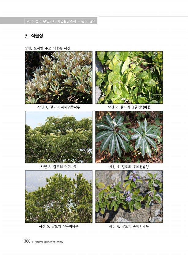 2015 전국 무인도서 자연환경조사 완도 권역 388 ? National Institute of Ecology 3. 식물상 별첨. 도서별 주요 식물종 사진 사진 1. 갈도의 까마귀쪽나무 사진 2. 갈도의 덩굴민백미꽃 사진 3. 갈도의 머귀나무 사진 4. 갈도의 무늬천남성 사진 5. 갈도의 산유자나무 사진 6. 갈도의순비기나무