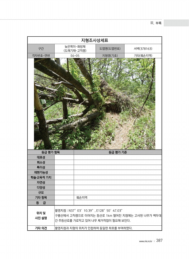 Ⅲ. 부록 www.nie.re.kr ? 387 지형조사상세표 구간 늦은목이화방재 도래기재-고직령 도엽명 도엽번호 서벽 378163 격자번호-연번 E6-05 지형명 기호 기타 훼손지역 등급 평가 항목 등급 평가 기준 대표성 희소성 특이성 재현가능성 학술?교육적 가치 자연성 다양성 규모 기타 항목 훼손지역 등 급 위치 및 사진 설명 촬영지점 N37°03′10.39″, E128°50′47.03″ 구룡산에서 고직령으로 이어지는 등산로 1km 떨어진 지점에는 고사된 나무가 백두대 간 주등산로를 가로막고 있어 나무 제거작업이 필요해 보인다. 기타 의견 촬영지점과 지형의 위치가 인접하여 동일한 좌표를부여하였다.