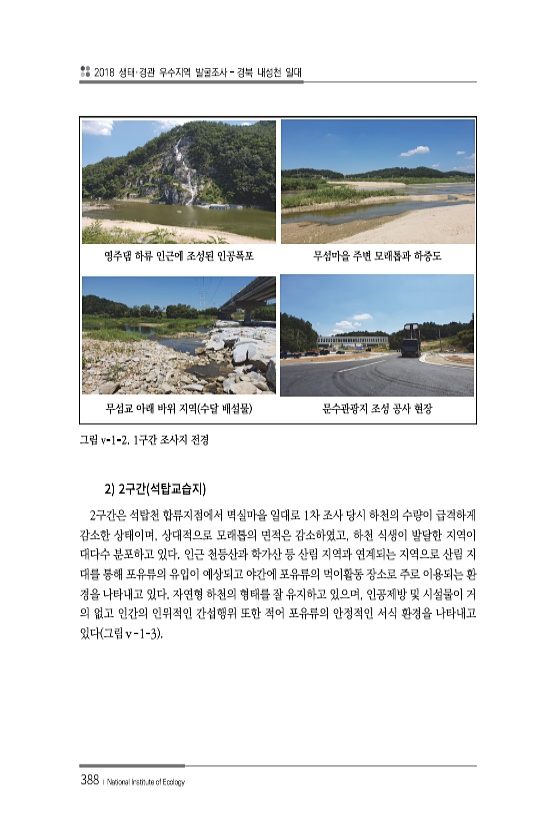 2018 생태·경관 우수지역 발굴조사 경북 내성천 일대 388 ? National Institute of Ecology 영주댐 하류 인근에 조성된 인공폭포 무섬마을 주변 모래톱과 하중도 무섬교 아래 바위 지역 수달 배설물 문수관광지 조성 공사 현장 그림 v-1-2. 1구간 조사지 전경 2 2 2구간은 석탑천 합류지점에서 멱실마을 일대로 1차 조사 당시 하천의 수량이 급격하게 감소한 상태이며, 상대적으로 모래톱의 면적은 감소하였고, 하천 식생이 발달한 지역이 대다수 분포하고 있다. 인근 천등산과 학가산 등 산림 지역과 연계되는 지역으로 산림 지 대를 통해 포유류의 유입이 예상되고 야간에 포유류의 먹이활동 장소로 주로 이용되는 환 경을 나타내고 있다. 자연형 하천의 형태를 잘 유지하고 있으며, 인공제방 및 시설...