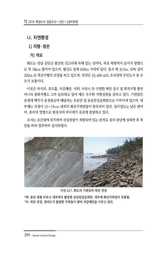 2018 특정도서 정밀조사 신안 1 남부권역 384 ? National Institute of Ecology 1 · 화도는 전남 신안군 팔금면 진고리에 속해 있는 섬이다. 목포 북항에서 남서서 방향으 로 약 18km 떨어져 있으며, 팔금도 동쪽 650m 거리에 있다. 동서 폭 315m, 남북 길이 200m 로 역삼각형의 모양을 띠고 있으며, 면적은 33,400 ㎡로 조사권역 무인도서 중 규 모가 보통이다. 이곳은 파식대, 포트홀, 자갈해안, 사취, 타포니 등 다양한 해안 침식 및 퇴적지형 뿐만 아니라 풍화지형도 고루 분포하고 있어 매우 우수한 지형경관을 갖추고 있다. 기반암은 중생대 백악기 유천층군에 해당되는 유문암 및 유문암질응회암으로 이루어져 있으며, 내 부에는 직경이 10∼15cm 내외의 화산각력암들이...