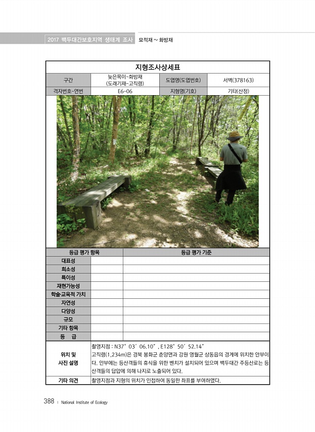 2017 백두대간보호지역 생태계 조사 묘적재 화방재 388 ? National Institute of Ecology 지형조사상세표 구간 늦은목이화방재 도래기재-고직령 도엽명 도엽번호 서벽 378163 격자번호-연번 E6-06 지형명 기호 기타 산정 등급 평가 항목 등급 평가 기준 대표성 희소성 특이성 재현가능성 학술?교육적 가치 자연성 다양성 규모 기타 항목 등 급 위치 및 사진 설명 촬영지점 N37°03′06.10″, E128°50′52.14″ 고직령 1,234m 은 경북 봉화군 춘양면과 강원 영월군 상동읍의 경계에 위치한 안부이 다. 안부에는 등산객들의 휴식을 위한 벤치가 설치되어 있으며 백두대간 주등산로는 등 산객들의 답압에 의해 나지로 노출되어 있다. 기타 의견 촬영지점과 지형의 위치가 인접하여 동일...