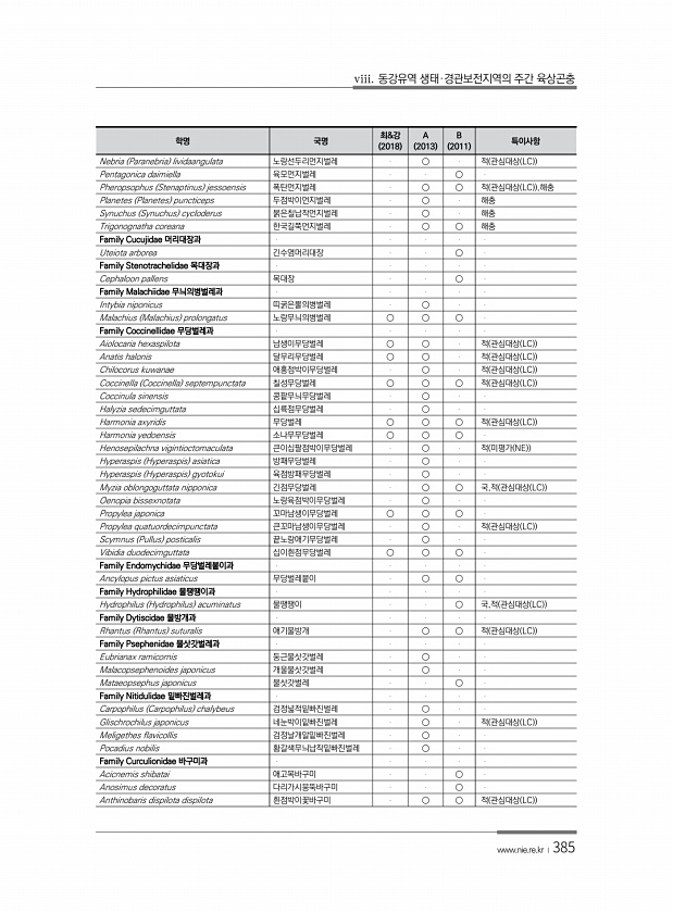 viii. 동강유역 생태·경관보전지역의 주간 육상곤충 www.nie.re.kr ?385 학명 국명 최&강 2018 A 2013 B 2011 특이사항 Nebria Paranebria lividaangulata 노랑선두리먼지벌레 ○ 적 관심대상 LC Pentagonica daimiella 육모먼지벌레 ○ Pheropsophus Stenaptinus jessoensis 폭탄먼지벌레 ○ ○ 적 관심대상 LC ,해충 Planetes Planetes puncticeps 두점박이먼지벌레 ○ 해충 Synuchus Synuchus cycloderus 붉은칠납작먼지벌레 ○ 해충 Trigonognatha coreana 한국길쭉먼지벌레 ○ ○ 해충 Family Cucujidae 머리대장과 ...