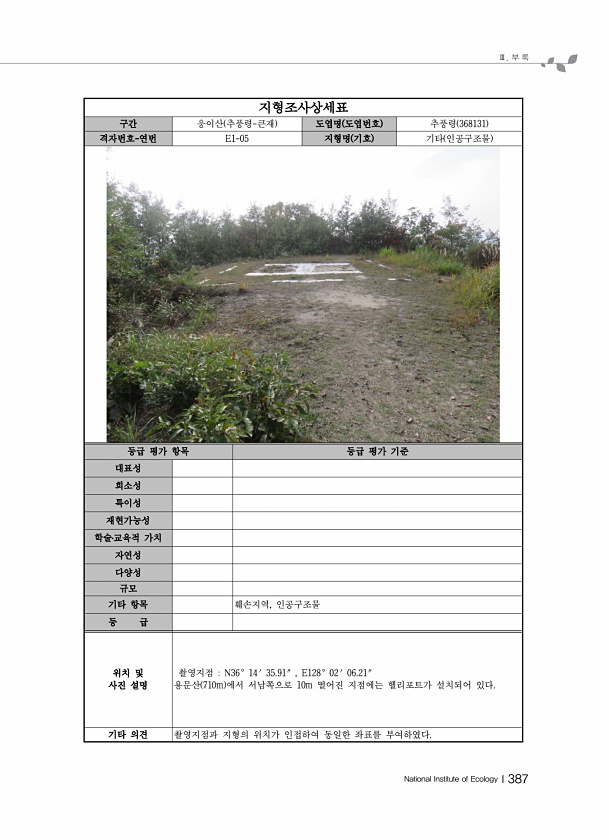 Ⅲ. 부 록 National Institute of EcologyⅠ387 지형조사상세표 구간 웅이산 추풍령-큰재 도엽명 도엽번호 추풍령 368131 격자번호-연번 E1-05 지형명 기호 기타 인공구조물 등급 평가 항목 등급 평가 기준 대표성 희소성 특이성 재현가능성 학술?교육적 가치 자연성 다양성 규모 기타 항목 훼손지역, 인공구조물 등 급 위치 및 사진 설명 촬영지점 N36° 14′ 35.91″ , E128° 02′ 06.21″ 용문산 710m 에서 서남쪽으로 10m 떨어진 지점에는 헬리포트가 설치되어 있다. 기타 의견 촬영지점과 지형의 위치가 인접하여 동일한 좌표를부여하였다.