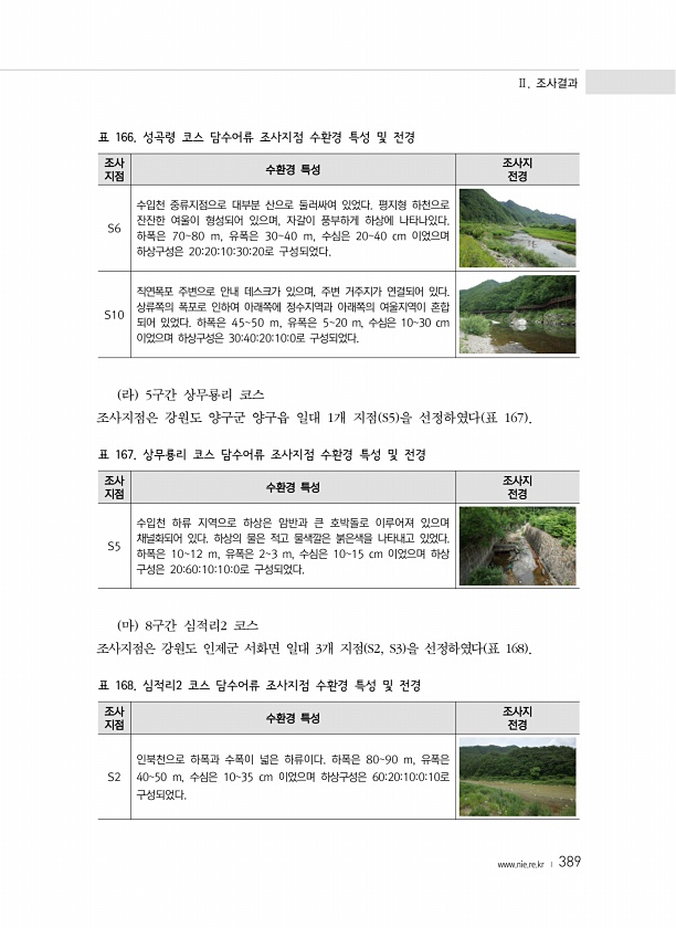 Ⅱ. 조사결과 www.nie.re.kr ? 389 조사 지점 수환경 특성 조사지 전경 S2 인북천으로 하폭과 수폭이 넓은 하류이다. 하폭은 8090 m, 유폭은 4050 m, 수심은 1035 cm 이었으며 하상구성은 602010010로 구성되었다. 표 168. 심적리2 코스 담수어류 조사지점 수환경 특성 및 전경 조사 지점 수환경 특성 조사지 전경 S6 수입천 중류지점으로 대부분 산으로 둘러싸여 있었다. 평지형 하천으로 잔잔한 여울이 형성되어 있으며, 자갈이 풍부하게 하상에 나타나있다. 하폭은 7080 m, 유폭은 3040 m, 수심은 2040 cm 이었으며 하상구성은 2020103020로 구성되었다. S10 직연폭포 주변으로 안내 데스크가 있으며, 주변 거주지가 연결되어 있다. 상류쪽의 폭포로 인하여 아래...