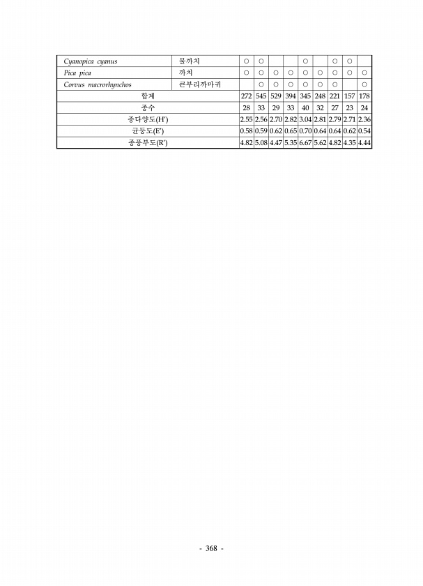 368 Cyanopica cyanus 물까치 ○ ○ ○ ○ ○ Pica pica 까치 ○ ○ ○ ○ ○ ○ ○ ○ ○ Corvus macrorhynchos 큰부리까마귀 ○ ○ ○ ○ ○ ○ ○ 합계 272 545 529 394 345 248 221 157 178 종수 28 33 29 33 40 32 27 23 24 종다양도 H2.55 2.56 2.70 2.82 3.04 2.81 2.79 2.71 2.36 균등도 E0.58 0.59 0.62 0.65 0.70 0.64 0.64 0.62 0.54 종풍부도 R4.82 5.08 4.47 5.35 6.67 5.62 4.82 4.354.44