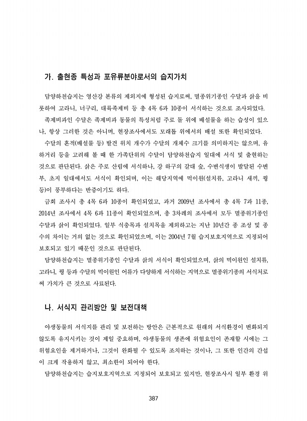 387 가. 출현종 특성과 포유류분야로서의 습지가치 담양하천습지는 영산강 본류의 제외지에 형성된 습지로써, 멸종위기종인 수달과 삵을 비 롯하여 고라니, 너구리, 대륙족제비 등 총 4목 6과 10종이 서식하는 것으로 조사되었다. 족제비과인 수달은 족제비과 동물의 특성처럼 주로 돌 위에 배설물을 하는 습성이 있으 나, 항상 그러한 것은 아니며, 현장조사에서도 모래톱 위에서의 배설 또한 확인되었다. 수달의 흔적 배설물 등 발견 위치 개수가 수달의 개체수 크기를 의미하지는 않으며, 유 하거리 등을 고려해 볼 때 한 가족단위의 수달이 담양하천습지 일대에 서식 및 출현하는 것으로 판단된다. 삵은 주로 산림에 서식하나, 강 하구의 갈대 숲, 수변식생이 발달된 수변 부, 초지 일대에서도 서식이 확인되며, 이는 해당지역에 ...