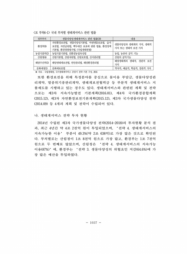 1037 정부부처 생물다양성?생태계서비스 관련 법률 19 내용 환경부 9 자연환경보전법, 생물다양성기본법, 야생생물보호법, 습지 보전법, 자연공원법, 백두대간 보호에 관한 법률, 환경정책 기본법, 환경영향평가법, 국립생태원법 생물다양성과 생태계의 가치, 생태적 가치 또는 생태적 보전 가치 농림식품부 2 농업식품기본법, 친환경농업육성법 농업, 농촌의 공익 기능 산림청 4 산림기본법, 산림자원법, 산림보호법, 산지관리법 산림의 공익기능 해양수산부 3 해양생태계보전법, 연안관리법, 해양환경관리법 해양생태계의 생태적, 경관적 보전 가치 문화재청 1 문화재보호법 역사적, 예술적, 학술적, 경관적 가치 ※ 자료 국립생태원, 국가생태계서비스 중장기 전략 기본 구상, 2016 표 부록6-1 국내 부처별 생태계서비스 관련 ...