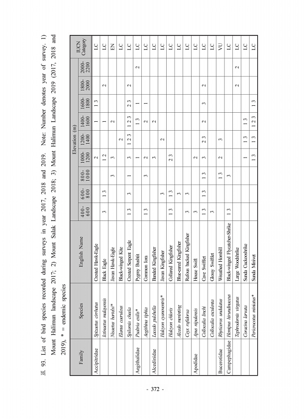 93. List of bird species recorded during surveys in year 2017, 2018 and 2019. NoteNumber denotes year of survey. 1 Mount Halimun landscape 2017; 2 Mount Salak Landscape 2018; 3 Mount Halimun Landscape 2019 2017, 2018 and 2019 , * = endemic species Family Species English Name Elevation m IUCN 400- Category 600 600- 800 800- 1000 1000- 1200 1200- 1400 1400- 1600 1600- 1800 1800- 2000 2000- 2200 Acci...