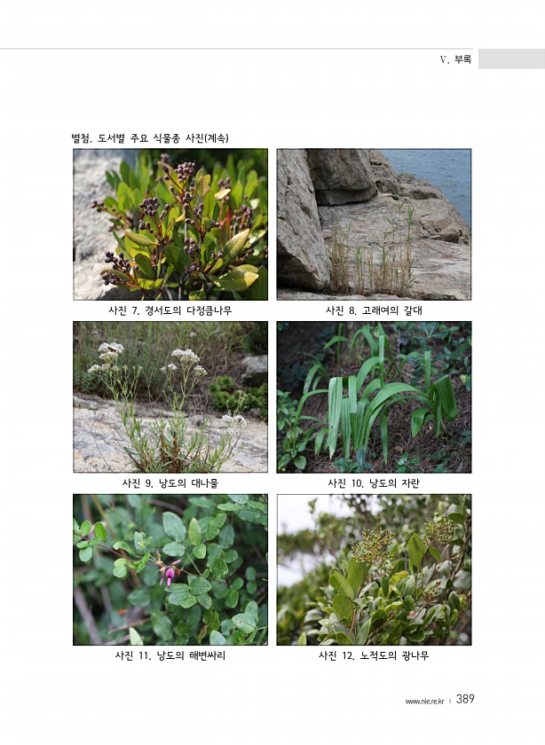 Ⅴ. 부록 www.nie.re.kr ? 389 별첨. 도서별 주요 식물종 사진 계속 사진 7. 경서도의 다정큼나무 사진 8. 고래여의 갈대 사진 9. 낭도의 대나물 사진 10. 낭도의 자란 사진 11. 낭도의 해변싸리 사진 12. 노적도의광나무