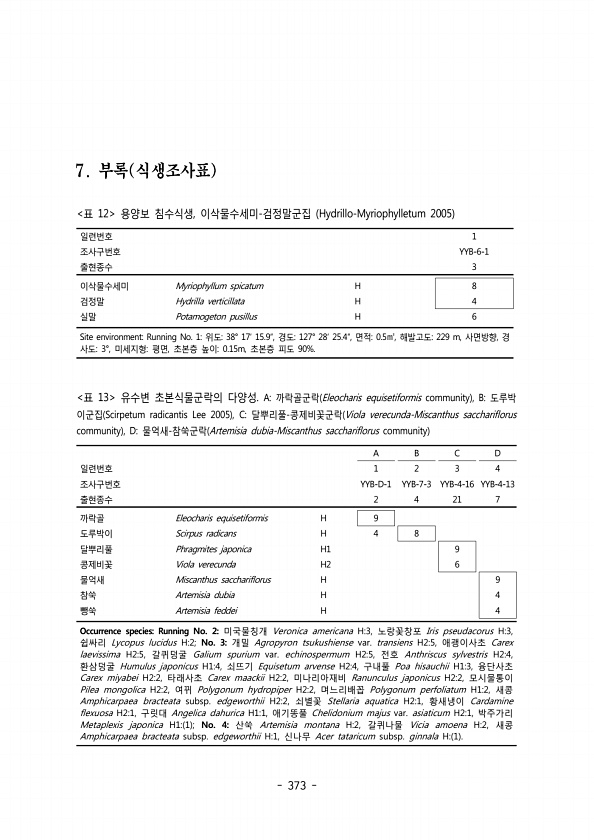 373 일련번호 1 조사구번호 YYB-6-1 출현종수 3 이삭물수세미 Myriophyllum spicatum H 8 검정말 Hydrilla verticillata H 4 실말 Potamogeton pusillus H 6 Site environmentRunning No. 138° 17 15.9 , 127° 28 25.4 , 0.5 , 229 m, , 위도 ′ ″ 경도 ′ ″ ㎡ 면적 해발고도 사면방향 경 사도 미세지형 평면 초본층 높이 초본층 피도 3°, , 0.15m, 90%. 표 12 용양보 침수식생 이삭물수세미 검정말군집 , Hydrillo-Myriophylletum 2005 A B C D 일련번호 1 2 3 4 조사구번호 YYB-D-1 YYB-7-3 YYB-4-16 YYB-4-13 출현종수 2 4 21...