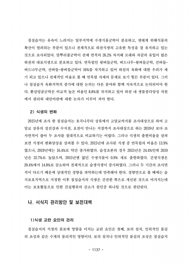 1137 침실습지는 유속이 느려지는 일부지역에 수생식물군락이 분포하고, 생태계 위해식물의 확산이 염려되는 부분이 있으나 전체적으로 하천식생의 고유한 특성을 잘 유지하고 있는 것으로 조사되었다. 달뿌리풀군락이 전체 면적의 26.2% 차지해 모래와 자갈의 유입이 많은 하천의 대표식생으로 분포하고 있다. 연목림인 왕버들군락, 버드나무-왕버들군락, 선버들- 버드나무군락, 선버들-왕버들군락이 16%를 차지하고 있어 하천의 육화에 대한 우려가 제 기 되고 있으나 전체적인 비율로 볼 때 연목림 자체의 문제로 보기 힘든 부분이 있다. 그러 나 침실습지 육화지역의 증가에 대한 논의는 다른 분야와 함께 지속적으로 논의되어야 한 다. 환삼덩굴군락은 비교적 높은 비율인 8.8%를 차지하고 있어 하천 내 생물종다양성 차원 에서 관...