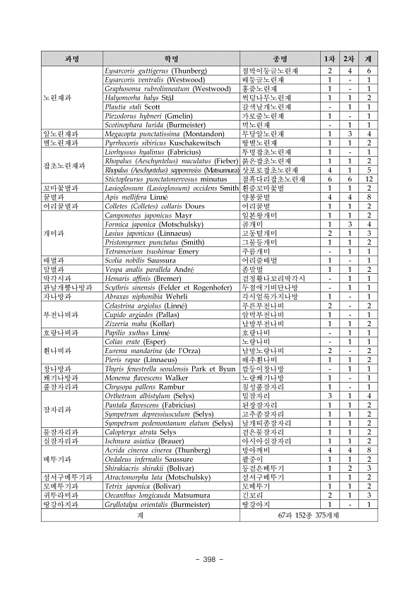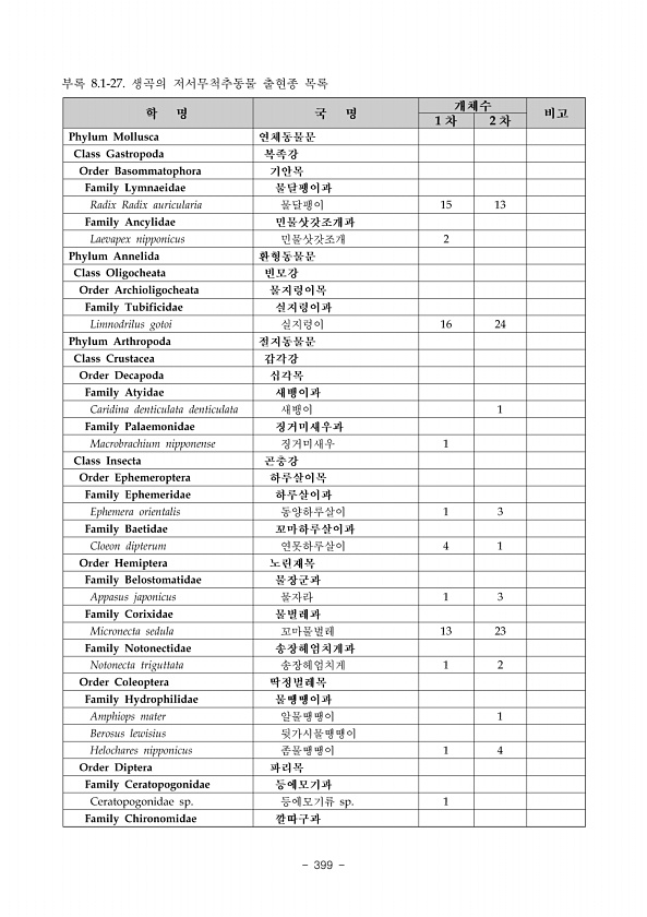 2018 DMZ 일원 생태계 조사 민통선이북지역 중부산악권역 390 ? National Institute of Ecology 학명 국명 도창리 성재산 대성산 적근산 산양리 주파리 고둔골 비운이 합계 조사 시기 비고 Baetis ursinus 방울하루살이 50 25 6 5 12 1 99 봄,여름,가을 Baetiella tuberculata 애호랑하루살이 7 15 20 32 11 41 46 76 248 봄,여름,가을 Cloeon dipterum 연못하루살이 4 65 21 1 91 봄,가을 Acentrella sibirica 콩알하루살이 15 22 11 7 13 2 70 봄,여름,가을 Procloeon pennulatum 갈고리하루살이 81 13 20 11 15 10 8 1 159 봄,여름,가을 Labiobaet...