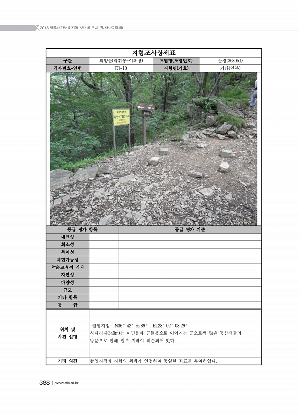 2016 백두대간보호지역 생태계 조사 밀재묘적재 388Ⅰwww.nie.re.kr 지형조사상세표 구간 희양산 악휘봉-이화령 도엽명 도엽번호 문경 368051 격자번호-연번 E1-10 지형명 기호 기타 안부 등급 평가 항목 등급 평가 기준 대표성 희소성 특이성 재현가능성 학술?교육적 가치 자연성 다양성 규모 기타 항목 등 급 위치 및 사진 설명 촬영지점 N36° 42′ 56.89″ , E128° 02′ 08.29″ 사다리재 840m 는 이만봉과 곰틀봉으로 이어지는 곳으로써 많은 등산객들의 방문으로 인해 일부 지역이 훼손되어 있다. 기타 의견 촬영지점과 지형의 위치가 인접하여 동일한 좌표를부여하였다.