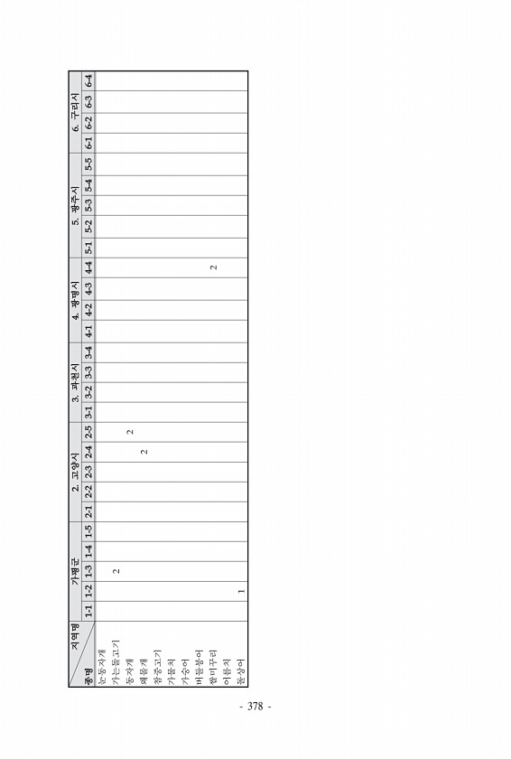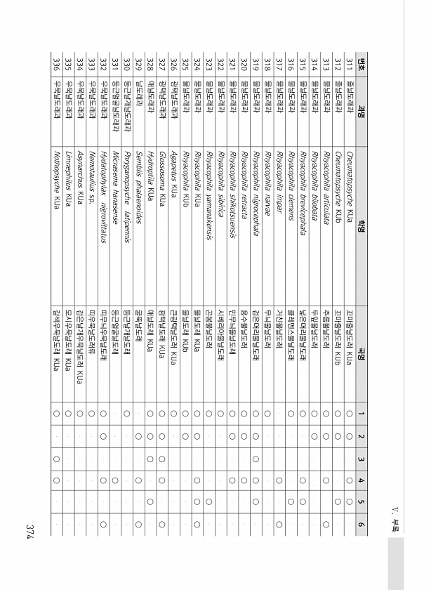 Ⅴ. 부록 374 번호 과명 학명 국명 1 2 3 4 5 6 311 줄날도래과 Cheumatopsyche KUa 꼬마줄날도래 KUa ○ ○ ○ ○ 312 줄날도래과 Cheumatopsyche KUb 꼬마줄날도래 KUb ○ ○ ○ 313 물날도래과 Rhyacophila articulata 주름물날도래 ○ ○ ○ ○ 314 물날도래과 Rhyacophila bilobata 두잎물날도래 ○ ○ 315 물날도래과 Rhyacophila brevicephala 넓은머리물날도래 ○ ○ ○ 316 물날도래과 Rhyacophila clemens 클레멘스물날도래 ○ ○ 317 물날도래과 Rhyacophila impar 거친물날도래 ○ ○ 318 물날...