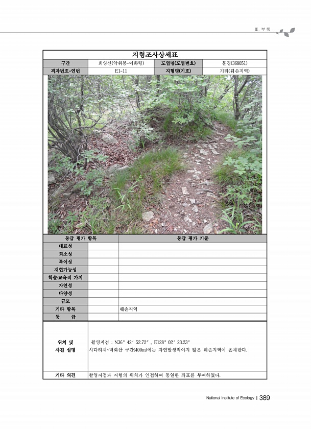 Ⅲ. 부 록 National Institute of EcologyⅠ389 지형조사상세표 구간 희양산 악휘봉-이화령 도엽명 도엽번호 문경 368051 격자번호-연번 E1-11 지형명 기호 기타 훼손지역 등급 평가 항목 등급 평가 기준 대표성 희소성 특이성 재현가능성 학술?교육적 가치 자연성 다양성 규모 기타 항목 훼손지역 등 급 위치 및 사진 설명 촬영지점 N36° 42′ 52.72″ , E128° 02′ 23.23″ 사다리재백화산 구간 400m 에는 자연발생적이지 않은 훼손지역이 존재한다. 기타 의견 촬영지점과 지형의 위치가 인접하여 동일한 좌표를부여하였다.