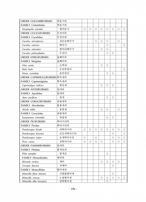 370 ORDER COLUMBIFORMES 비둘기목 FAMILY Columbidae 비둘기과 Streptopelia orietalis 멧비둘기 ○ ○ ○ ○ ○ ○ ○ ○ ORDER CUCULIFORMES 두견이목 FAMILY Cuculidae 두견이과 Cuculus micropterus 검은등뻐꾸기 ○ ○ ○ ○ Cuculus canorus 뻐꾸기 ○ ○ Cuculus saturatus 벙어리뻐꾸기 ○ ○ Cuculus poliocephalus 두견이 ○ ○ ORDER STRIGIFORMES 올빼미목 FAMILY Strigidae 올빼미과 Otus sunia 소쩍새 ○ ○ Bubo bubo 수리부엉이 ○ Ninox scutulata 솔부엉이 ○ ○ ORDER CAPRIMULGIFORMES 쏙독새목 FAMI...