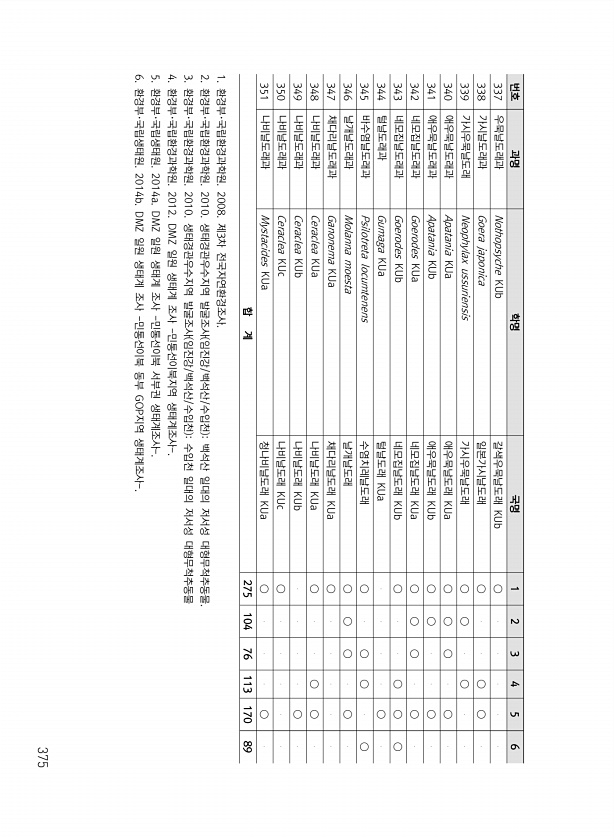 375 번호 과명 학명 국명 1 2 3 4 5 6 337 우묵날도래과 Nothopsyche KUb 갈색우묵날도래 KUb ○ 338 가시날도래과 Goera japonica 일본가시날도래 ○ ○ ○ 339 가시우묵날도래 Neophylax ussuriensis 가시우묵날도래 ○ ○ ○ 340 애우묵날도래과 Apatania KUa 애우묵날도래 KUa ○ ○ ○ ○ 341 애우묵날도래과 Apatania KUb 애우묵날도래 KUb ○ ○ ○ 342 네모집날도래과 Goerodes KUa 네모집날도래 KUa ○ ○ ○ ○ 343 네모집날도래과 Goerodes KUb 네모집날도래 KUb ○ ○ ○ ○ 344 털날도래과 Gumaga KUa 털날도래 KUa...
