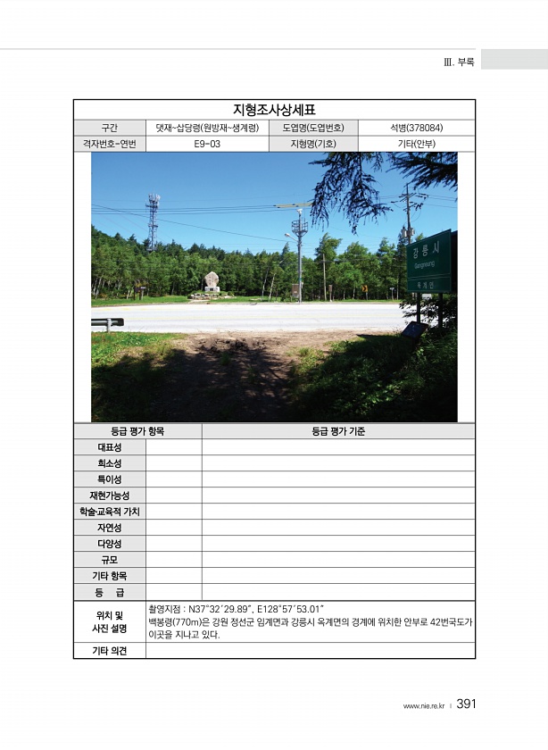 Ⅲ. 부록 www.nie.re.kr ? 391 지형조사상세표 구간 댓재삽당령 원방재생계령 도엽명 도엽번호 석병 378084 격자번호-연번 E9-03 지형명 기호 기타 안부 등급 평가 항목 등급 평가 기준 대표성 희소성 특이성 재현가능성 학술?교육적 가치 자연성 다양성 규모 기타 항목 등 급 위치 및 사진 설명 촬영지점 N37°32′29.89″, E128°57′53.01″ 백봉령 770m 은 강원 정선군 임계면과 강릉시 옥계면의 경계에 위치한 안부로 42번국도가 이곳을 지나고 있다. 기타의견