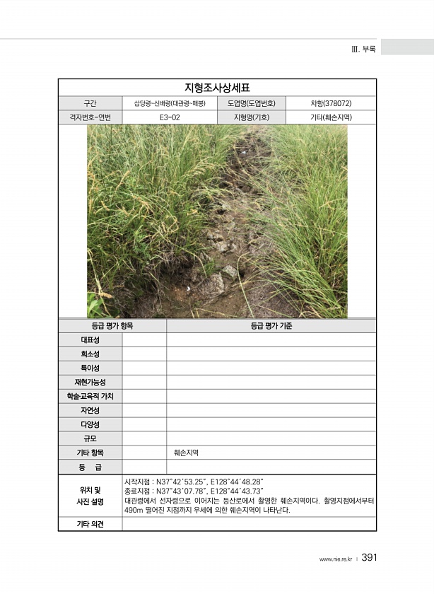 Ⅲ. 부록 www.nie.re.kr ? 391 지형조사상세표 구간 삽당령신배령 대관령매봉 도엽명 도엽번호 차항 378072 격자번호-연번 E3-02 지형명 기호 기타 훼손지역 등급 평가 항목 등급 평가 기준 대표성 희소성 특이성 재현가능성 학술?교육적 가치 자연성 다양성 규모 기타 항목 훼손지역 등 급 위치 및 사진 설명 시작지점 N37°42′53.25″, E128°44′48.28″ 종료지점 N37°43′07.78″, E128°44′43.73″ 대관령에서 선자령으로 이어지는 등산로에서 촬영한 훼손지역이다. 촬영지점에서부터 490m 떨어진 지점까지 우세에 의한 훼손지역이 나타난다. 기타의견