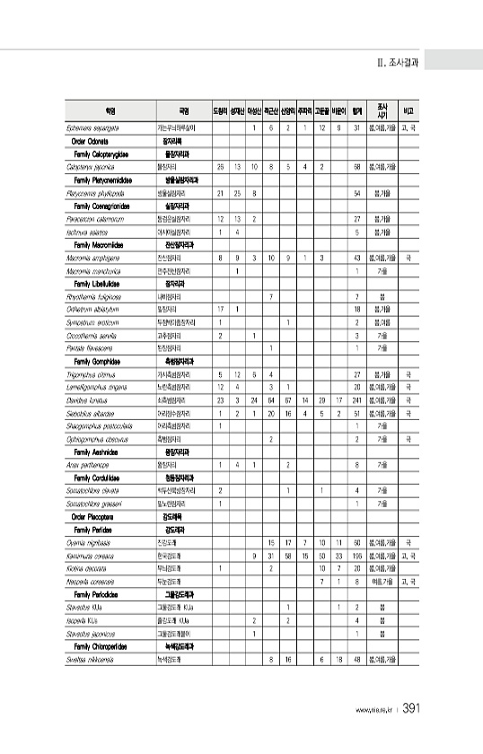 Ⅱ. 조사결과 www.nie.re.kr ? 391 학명 국명 도창리 성재산 대성산 적근산 산양리 주파리 고둔골 비운이 합계 조사 시기 비고 Ephemera separigata 가는무늬하루살이 1 6 2 1 12 9 31 봄,여름,가을 고, 국 Order Odonata 잠자리목 Family Calopterygidae 물잠자리과 Calopteryx japonica 물잠자리 26 13 10 8 5 4 2 68 봄,여름,가을 Family Platycnemididae 방울실잠자리과 Platycnemis phyllopoda 방울실잠자리 21 25 8 54 봄,가을 Family Coenagrionidae 실잠자리과 Paracercion calamorum 등검은실잠자리 12 13 2 27 봄,가을 Ischnura asia...
