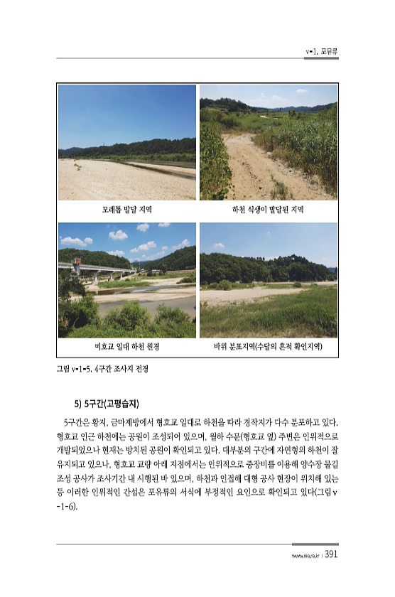 v-1. 포유류 www.nie.re.kr ?391 모래톱 발달 지역 하천 식생이 발달된 지역 미호교 일대 하천 원경 바위 분포지역 수달의 흔적 확인지역 그림 v-1-5. 4구간 조사지 전경 5 5 5구간은 황지, 금마제방에서 형호교 일대로 하천을 따라 경작지가 다수 분포하고 있다. 형호교 인근 하천에는 공원이 조성되어 있으며, 월하 수문 형호교 옆 주변은 인위적으로 개발되었으나 현재는 방치된 공원이 확인되고 있다. 대부분의 구간에 자연형의 하천이 잘 유지되고 있으나, 형호교 교량 아래 지점에서는 인위적으로 중장비를 이용해 양수장 물길 조성 공사가 조사기간 내 시행된 바 있으며, 하천과 인접해 대형 공사 현장이 위치해 있는 등 이러한 인위적인 간섭은 포유류의 서식에 부정적인 요인으로 확인되고 있다 그림ⅴ -1...