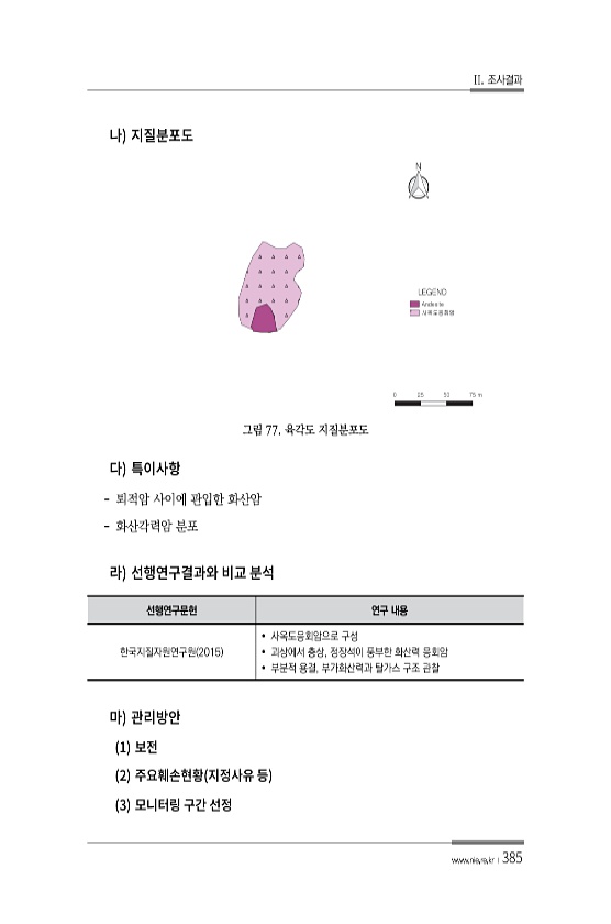 II. 조사결과 www.nie.re.kr ?385 그림 77. 육각도 지질분포도 퇴적암 사이에 관입한 화산암 화산각력암 분포 선행연구문헌 연구 내용 한국지질자원연구원 2015 ? 사옥도응회암으로 구성 ? 괴상에서 층상, 정장석이 풍부한 화산력 응회암 ? 부분적 용결, 부가화산력과 탈가스 구조 관찰 1 2 3