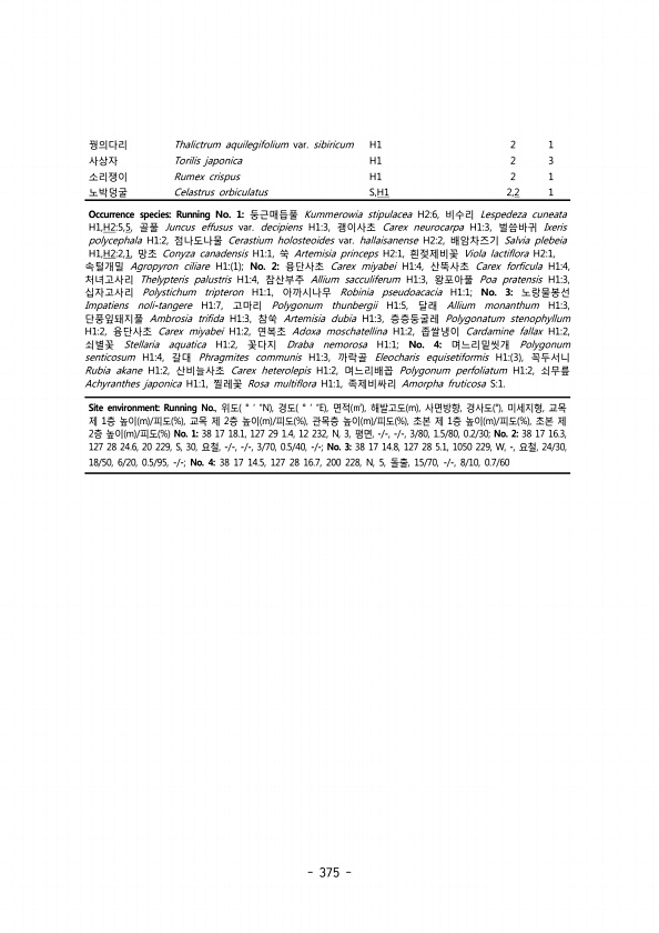 375 꿩의다리 Thalictrum aquilegifolium var. sibiricum H1 2 1 사상자 Torilis japonica H1 2 3 소리쟁이 Rumex crispus H1 2 1 노박덩굴 Celastrus orbiculatus S,H1 2,2 1 Occurrence speciesRunning No. 1둥근매듭풀 Kummerowia stipulacea H26, 비수리 Lespedeza cuneata H1,H25,5, 골풀 Juncus effusus var. decipiens H13, 괭이사초 Carex neurocarpa H13, 벌씀바귀 Ixeris polycephala H12, 점나도나물 Cerastium holosteoides var. hallaisanense H22, 배암차즈기 Sa...
