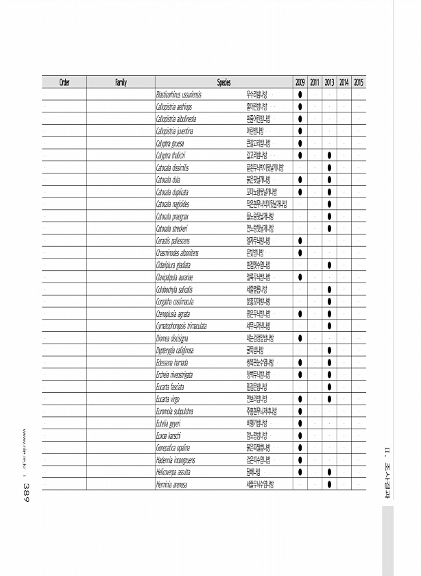 389 Order Family Species 2009 2011 2013 2014 2015 Blasticorhinus ussuriensis 우수리밤나방 ● Callopistria aethiops 줄어린밤나방 ● Callopistria albolineola 흰줄어린밤나방 ● Callopistria juventina 어린밤나방 ● Calyptra gruesa 큰갈고리밤나방 ● Calyptra thalictri 갈고리밤나방 ● ● Catocala dissimilis 끝흰무늬박이뒷날개나방 ● Catocala dula 붉은뒷날개나방 ● ● Catocala duplicata 꼬마노랑뒷날...