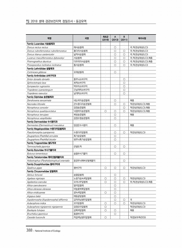 2018 생태·경관보전지역 정밀조사 동강유역 388 ? National Institute of Ecology 학명 국명 최&강 2018 A 2013 B 2011 특이사항 Family Lucanidae 사슴벌레과 Dorcus rectus rectus 애사슴벌레 ○ 국,적 관심대상 LC Dorcus rubrofemoratus rubrofemoratus 홍다리사슴벌레 ○ ○ 국,적 관심대상 LC Dorcus titanus castanicolor 넓적사슴벌레 ○ ○ 국,적 관심대상 LC Lucanus maculifemoratus dybowskyi 사슴벌레 ○ ○ 국,적 관심대상 LC ,해충 Prismognathus dauricus 다우리아사슴벌레 ○ ○ 국,적 관심대상 LC ,해충 Prosop...