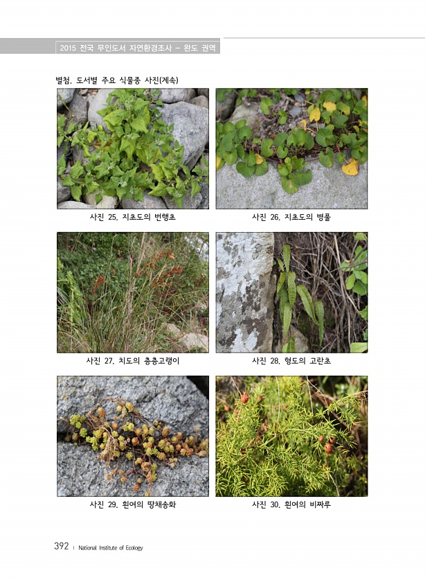2015 전국 무인도서 자연환경조사 완도 권역 392 ? National Institute of Ecology 별첨. 도서별 주요 식물종 사진 계속 사진 25. 지초도의 번행초 사진 26. 지초도의 병풀 사진 27. 치도의 층층고랭이 사진 28. 형도의 고란초 사진 29. 흰여의 땅채송화 사진 30. 흰여의비짜루