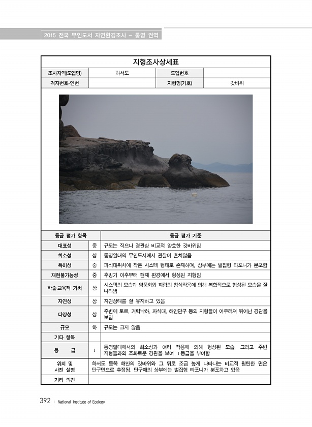 2015 전국 무인도서 자연환경조사 통영 권역 392 ? National Institute of Ecology 지형조사상세표 조사지역 도엽명 하서도 도엽번호 격자번호-연번 지형명 기호 갓바위 등급 평가 항목 등급 평가 기준 대표성 중 규모는 작으나 경관상 비교적 양호한 갓바위임 희소성 상 통영일대의 무인도서에서 관찰이 흔치않음 특이성 중 파식대위치에 작은 시스텍 형태로 존재하며, 상부에는 벌집형 타포니가 분포함 재현불가능성 중 후빙기 이후부터 현재 환경에서 형성된 지형임 학술?교육적 가치 상 시스텍의 모습과 염풍화와 파랑의 침식작용에 의해 복합적으로 형성된 모습을 잘 나타냄 자연성 상 자연상태를 잘 유지하고 있음 다양성 상 주변에 토르, 거력낙하, 파식대, 해안단구 등의 지형들이 어우러져 뛰어난 경관을 보임...