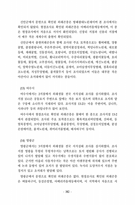 382 신안군에서 문헌으로 확인된 외래곤충은 방패광대노린재이며 본 조사에서는 확인되지 않았다. 현장조사로 확인된 외래곤충은 아메리카동애등에이며, 이 종 은 현장조사에서 처음으로 서식이 화인되었다. 신장리 지점과 신용리 지점에 서 매우 적은 개체수의 출현이 확인되었다. 신안군에서 출현외래곤충과 함께 조사된 주요 토착종으로는 황띠배벌, 양봉 꿀벌, 줄점팔랑나비, 푸른부전나비, 점박이꽃검정파리, 썩덩나무노린재, 대모꽃 등에, 재래꿀벌, 깃동잠자리, 호랑나비, 검정오이잎벌레, 극남노랑나비, 네발나 비, 어리호박벌, 긴꼬리, 황나꼬리박각시, 수중다리꽃등에, 광붙이꽃등에, 호리 꽃등에, 꽃등에, 고추잠자리, 왕꽃등에, 우리가시허리노린재, 애긴노린재, 팥중 이, 알락수염노린재, 더듬이긴노린재, 곰개미, 꼬마남생이무당벌레...
