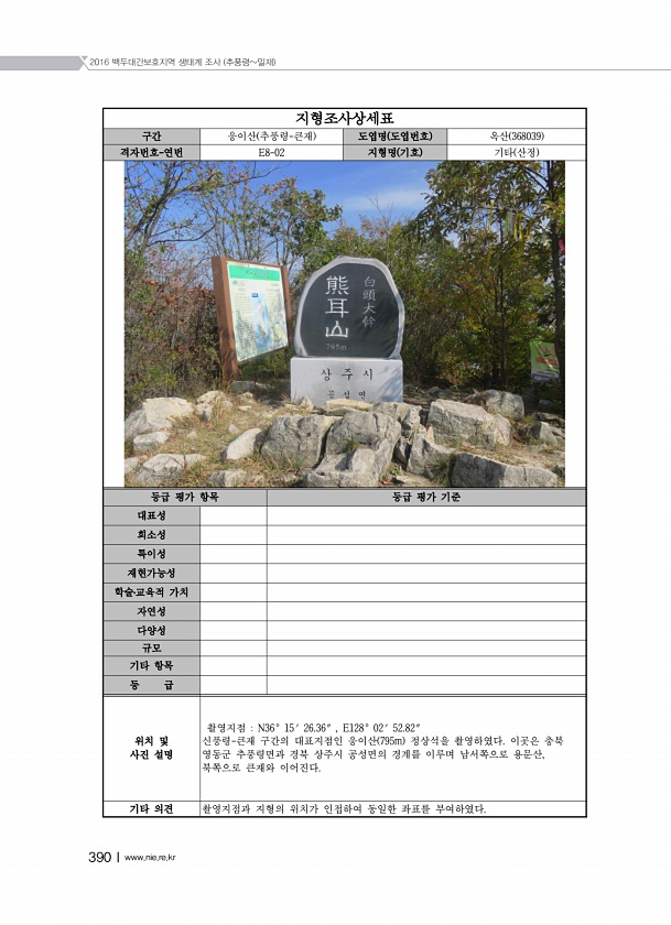 2016 백두대간보호지역 생태계 조사 추풍령밀재 390Ⅰwww.nie.re.kr 지형조사상세표 구간 웅이산 추풍령-큰재 도엽명 도엽번호 옥산 368039 격자번호-연번 E8-02 지형명 기호 기타 산정 등급 평가 항목 등급 평가 기준 대표성 희소성 특이성 재현가능성 학술?교육적 가치 자연성 다양성 규모 기타 항목 등 급 위치 및 사진 설명 촬영지점 N36° 15′ 26.36″ , E128° 02′ 52.82″ 신풍령-큰재 구간의 대표지점인 웅이산 795m 정상석을 촬영하였다. 이곳은 충북 영동군 추풍령면과 경북 상주시 공성면의 경계를 이루며 남서쪽으로 용문산, 북쪽으로 큰재와 이어진다. 기타 의견 촬영지점과 지형의 위치가 인접하여 동일한 좌표를부여하였다.