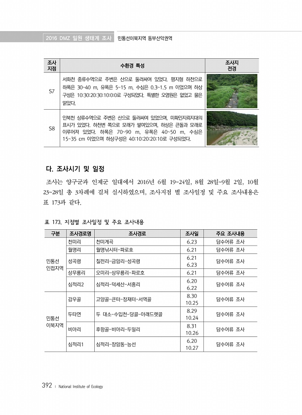 2016 DMZ 일원 생태계 조사 민통선이북지역 동부산악권역 392 ? National Institute of Ecology 조사 지점 수환경 특성 조사지 전경 S7 서화천 중류수역으로 주변은 산으로 둘러싸여 있었다. 평지형 하천으로 하폭은 3040 m, 유폭은 515 m, 수심은 0.31.5 m 이었으며 하상 구성은 103020301000로 구성되었다. 특별한 오염원은 없었고 물은 맑았다. S8 인북천 상류수역으로 주변은 산으로 둘러싸여 있었으며, 미확인지뢰지대의 표시가 있었다. 하천변 쪽으로 모래가 쌓여있으며, 하상은 큰돌과 모래로 이루어져 있었다. 하폭은 7090 m, 유폭은 4050 m, 수심은 1535 cm 이었으며 하상구성은 4010202010로 구성되었다. 다. 조사시기 및 일정 조사는 양구군과...