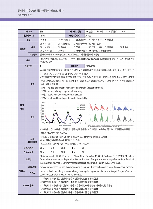 398 생태계 기후변화 영향·취약성·리스크 평가 -연구사례 분석- 사례 No. 316 사례 자료 유형 ■ 논문 □ 보고서 □ 기타 학술/기사자료 대상지 국가 Africa 대상지 지역 Africa 부문 □ 통합 □ 취약성평가 □ 영향성평가 □ 리스크평가 ■ 모델링 분류군 부문 □ 육상식물 □ 식물 침엽수 □ 식물 활엽수 □ 식물 초 본 □ 육상동물 □ 포유류 □ 조류 □ 곤충 류 □ 양서류 □ 파충류 □ 수상동식물 □ 어류 □ 저서무척추류 ■ 기타 모기매개성 질병 세부정보 말라리아 매개 모기 Anopheles gambiae s.s. 개체군 동태의 모델링 목적 아프리카를 대상으로, 온도와 모기 나이에 따른 Anopheles gambiae s.s.생존률과 관련하여 모기 개체군 동태 모델링 및 평가 기후인자 T 자...