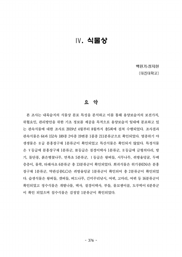 376 식물상.Ⅳ · 본 조사는 내륙습지의 식물상 분포 특성을 분석하고 이를 통해 용양보습지의 보전가치, 위협요인 관리방안을 위한 기초 정보를 제공을 목적으로 용양보습지 일대에 분포하고 있 , 는 관속식물에 대한 조사로 년 월부터 월까지 총 회에 걸쳐 수행되었다 조사결과 2019 4 8 5 관속식물은 과 속 종 아종 변종 품종 분류군으로 확인되었다 멸종위기 야 64 152 189 2 19 1 211 생생물은 급 분홍장구채 분류군이 확인되었고 특산식물은 확인되지 않았다 특정식물 Ⅱ 1 은 등 Ⅴ 급에 분홍장구채 분류군 등급은 질경이택사 분류군 등급에 금꿩의다리 방 1 , Ⅲ 1 , Ⅱ , 기 돌단풍 붉은병꽃나무 연복초 분류군 등급은 왕버들 시무나무 쥐방울덩굴 두메 , , , 5 , Ⅰ , , , 층층이 물쑥 ...
